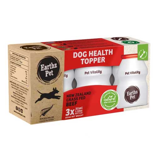 The perfect pet food topper with additional nutraceutical benefits. Designed with the assistance of Massey University, Earthz Pet Dog Health Topper in Grass Fed Beef flavour is a delicious gravy that not only helps our fussy pooches enjoy their meals more, but also provides an additional nutritional boost. Made from premium New Zealand ingredients Earthz Pet Health Topper contains: