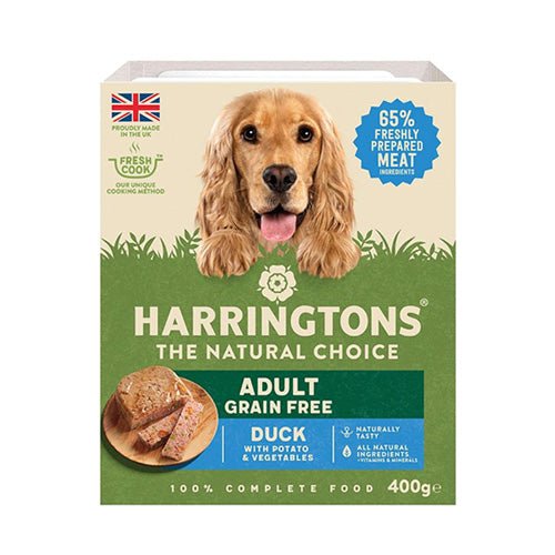 Introducing Harringtons Duck with Potato & Vegetables Wet Dog Food—a complete and balanced nutrition solution for all adult dogs. Crafted with 100% natural ingredients, added vitamins, and minerals, these delicious tray-cooked dinners are designed to delight your dog while providing a healthy, grain-free diet. Made in the UK, our recipe includes freshly prepared meat, cooked using our unique FreshCook® process to lock in nutrition and flavor.